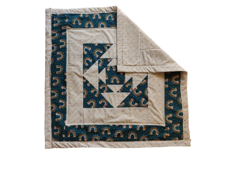 Manta actividades bebé modelo Arcoíris de Petons de Papallona, elaborada 100% en algodón y confeccionada a mano con dedicación. Cada pieza es única, con un diseño alegre y lleno de color.