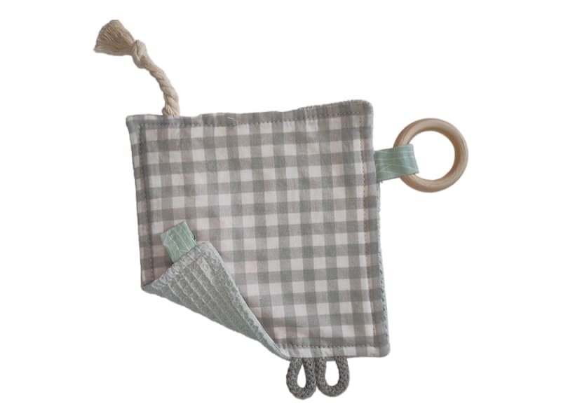 Mordedor sensorial algodón y materiales naturales con estampado de Vichy gris